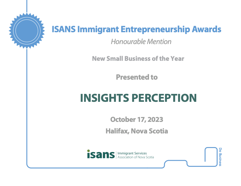 INSIGHTS PERCEPTION received the Entrepreneurship Honorable Mention for New Small Business of the Year 2023 delivered by Immigrant Services Association of Nova Scotia